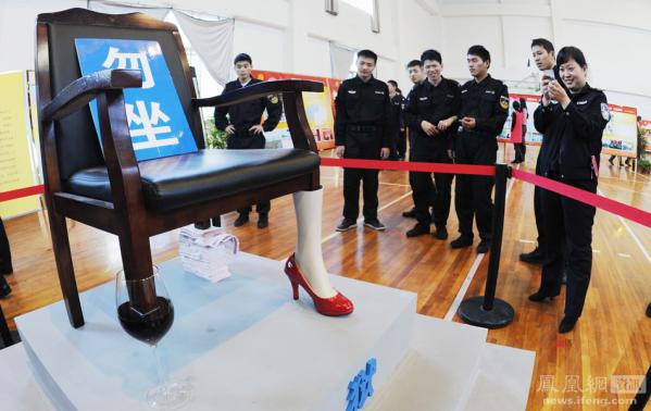 11月28日,浙江温岭,在反腐倡廉成果展上一把椅子吸引了众多的参观者。这把椅子的三只脚分别用酒杯、高跟鞋和金钱垫底,寓意一个人如果有了这三种贪念。 东方IC/吴鹏飞